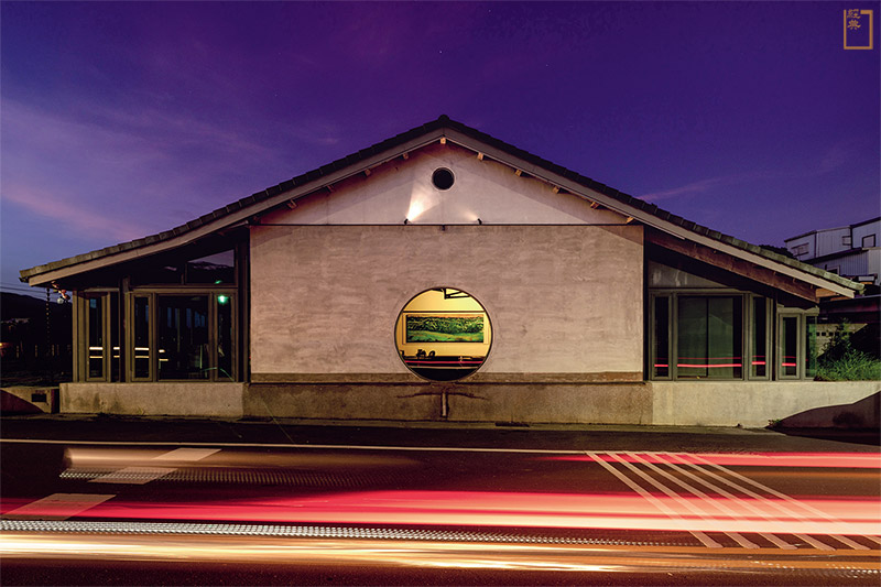 ↑ 夜幕低垂,閉館的穀倉藝術館仍透出微光。透過大圓窗,觀者能一窺鎮館之寶,蔣勳〈山醒來了〉的宏偉氣勢依舊可見。。