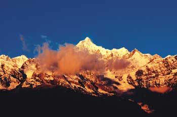 漢語稱這座山「梅里」,但藏語的意思是「河谷裡險峻雄偉的白色雪峰」。夕陽下,神山雪白的峰頂矗立在幽暗的山脈之巔,我凝視著神山金色的寶鼎,心存感激。迢迢千里的旅途中,是祂引導我進入大江源頭的神祕世界。