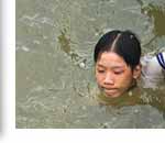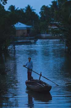 越南的魚米之鄉 相較於上游的波濤洶湧,這條母親河,真的是很溫和地對待著下游三角洲的子民。即便是每年定期氾濫的洪水也為土地帶來豐富的養分,滋育蒼生。九龍江平原土地肥沃、河渠遍布,糧食產出占越南總產量的百分之十,不僅是越南著名的糧倉,水產養殖業興隆,更是熱帶水果的主要產地。此外,全台灣目前十萬名以上的越南外籍配偶,近八成來自這個越南經濟發展的重點區域。 沿河而行,岸邊民眾取用母親河的河水,如此自然,洗沐、滌衣、戲水、以一只綁著繩索的塑膠桶,徐徐放進河面拉取引用,湄公河好像他們的7-11,日夜無休,隨時供應所需。 在這個行船比走路方便的水域,船在哪裡,家就在哪裡。船尾一處突出的小空間就是如廁之處,掀褲「噗通!噗通!」地解放,一點都不以外人眼光為意,咫尺之距卻是埋鍋造飯的鍋爐廚房。船上隨時晾晒著衣褲,吊床是不可或缺的席座,有時候船頭會插著幾束清香或供著鮮花,時見狗兒在空間有限的船板上興奮亂竄,船旁就是天然的游泳池,湄公河岸的孩子多諳水性、泳技超佳,從嬰兒時期,這條家門前的小河就是最消暑的大泳池。 河流是高速公路,是居家、是私人俱樂部、是公共澡堂,也是如廁與飲泉雙效合一的大水庫。河流,當然也是令人眼花撩亂的水上市場。 迎著晨曦,我們僱船趕赴一場水上盛會。在湄公河最大的鳳協水上市場,這個從每天清晨三、四點開始的水上市集,以蔬果批發為大宗,也是上下游農民物資的交流點。最特別的是船家將貨物樣本掛在竹竿,插在船頭上,賣些什麼?一目了然,一般稱此為「掛貨」。我們則將之戲稱為湄公河上的「家樂福」、「大潤發」。 豐饒土地上纍結的果實,在水上市場開演出花漾般的人間欣喜。香蕉、芒果、火龍果、波羅蜜、西瓜、高麗菜……色彩多樣豐實,如畫家塞尚的水果寫生畫一樣豐碩欲滴。清晨河水靜靜地流淌,遠方船隻麇集處已經鬧哄哄地進行著交易,突然「咄、咄、咄」的聲音在我們徐徐前進的船舷左側響起,一艘舢舨疾速駛近,只見女屠夫高舉菜刀,在泛著粉紅色澤的豬腿剁下第一刀,不旋踵,即成了水上市場上一節節待價而沽的生鮮商品。 流動小吃攤(船)如磁鐵般,吸附在大型躉售貨船邊,冒著熱煙的鍋爐上鮮牛河粉才剛起鍋,小販胡亂抓上一把綠色的紫蘇、魚腥草調味,濃稠的黑咖啡與白煉乳在冰塊的攪弄下,誘惑著一旁揮汗如雨的商家,金黃色的法國麵包裡料多實在、童叟無欺,提供勞動者一日之計的民生早餐。不久,數累了越盾(越南幣值,與新台幣比為四八八比一),飢腸轆轆的船家一口人就在船緣蹲坐一圈,拎起磁碗、竹筷,光著背膀大啖熱騰騰的河粉……。進入了這樣生動的場景,乍看起來鮮活有趣,其實,卻是貧苦的常民生活。 窮嗎?的確!湄公河沿岸居民年均所得不到美金一百元。苦嗎?我看見孩子的笑容比陽光還要燦爛!