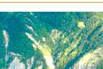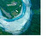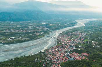 在高雄縣旗山鎮的嶺口附近,荖濃溪(左)與旗山溪(右)合流後稱為高屏溪。一般所謂的高屏溪,是指主要源頭之荖濃、旗山二溪,及其他支流所構成之廣大流域。全長一百七十一公里的高屏溪,是台灣流域面積最大、也是水量最大的河川。 |