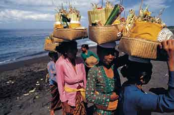 在巴里島人的輪迴觀念中,火葬代表今生的結束與來世的開始。除了將死者在烈火中化成灰燼,更按習俗將骨灰灑入海裡。婦女頭上頂的豐盛供品,顯示對這個儀式的重視程度。