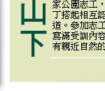 「我是志工解說員,提供免費服務,帶大家走一圈社頂。」他還是微微笑著,不過,開始招呼團員,吆喝大家集合。經驗告訴我,加一些字眼,可以讓遊客主動接近志工,或許說,更知道志工的存在。