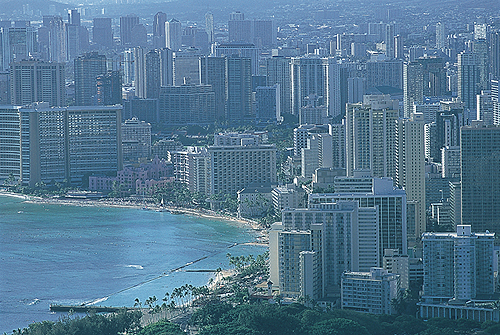 二○○○年,從鑽石山往下眺望威基基海灘,已經擠滿摩天度假旅館。