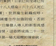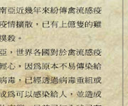 撰文/陳宏合(經典雜誌資深撰述) 攝影/蕭耀華(經典雜誌攝影召集人) 初秋中午,頂著烈日,驅車前往桃園鄉下一處養雞場;進入雞舍,過了幾許,原本驚慌逃竄的雞群,一隻接著一隻回過頭來將我們團團圍住,還拉長著脖子晃頭點腦盯著我們,那模樣就好像馬路或公共場合發生了意外,圍觀人群的景象。 這些雞隻只能就牠們所看到的,投以好奇的眼光;渾然不知也無法探求我們來訪的原因;牠們當然也絕不知道,近幾年來,已經有上億隻牠們的同類,不論健康與否,只因人類害怕受到禽流感(Avian Flu)病毒的威脅,被各國防疫單位以「防止禽流感疫情擴大」的理由而大肆撲殺。 這些雞隻與全世界的養殖雞隻一樣,既非禽流感病毒的原始帶原者,也非禽流感病毒的自然宿主,如今牠們面臨被撲殺的浩劫,只因牠們在某些國家已經成為禽流感病毒傳染給人的媒介;而禽流感病毒一旦成功地轉換為「人傳人」的新型流感病毒,若各國對於疫情控制不當,勢必將對人類的生命造成世紀的浩劫。 就在我們於此地採訪的同時,美國總統布希也在聯合國總部,公開宣布將發起國際合作,以防禽流感病毒演變成致命的全球性傳染病。 布希與各國領袖紛紛疾呼:「若我們持續對這種疾病置之不理,它將成為二十一世紀第一個大規模的傳染病。」韓籍世界衛生組織(WHO)祕書長李鍾郁,也在同一天警告說:「禽流感病毒隨時可能會突變成為人類的一大殺手!」 H5N1禽流感病毒造成人類死亡的案例,最早發生於一九九七年的香港;而當前禽流感疫情之所以受到各國重視,主要是從二○○三年以來,在亞洲與歐洲有越來越多人,因為感染禽流感病毒而致死;再加上人口密集的北半球,即將進入秋冬流感盛行的季節,秋冬之際正是候鳥大遷徙的時節,而候鳥與水禽動物正是禽流感病毒的主要自然宿主。各國防疫專家莫不憂心忡忡,禽流感病毒恐將隨著這些「沒有國家觀念」的候鳥,被散布到全球各地。 禽流感是家禽性流行性感冒,又稱鳥類流感,是動物間接觸傳染的病毒性疾病。鳥禽類感染此病,輕微者出現羽毛不平整與蛋量減少的症狀;若是感染「高病原性」禽流感,則會快速暴斃死亡,死亡率幾近百分之百。 禽流感疫情最早在一八七八年在義大利發現,當時受感染的鳥禽,就出現迅速暴斃死亡的現象。 由於人類一直到一九三七年才有辦法辨識病毒,迨至一九六一年,科學家才首度從南非燕鷗中,分離出讓人聞之色變的H5N1禽流感病毒。